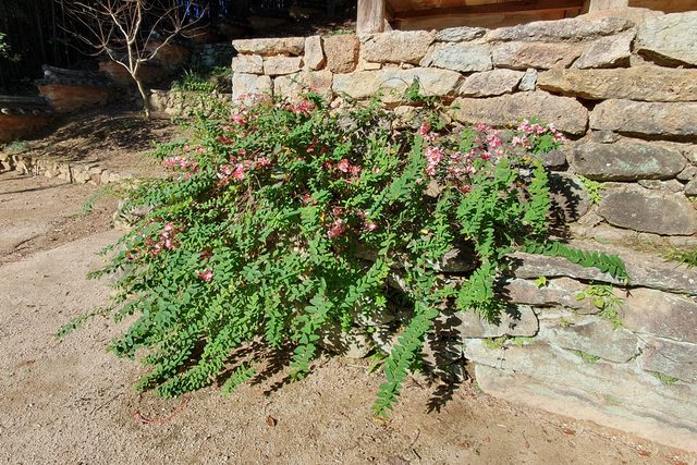 近看才發現是擬真的假花,秋色很蕭條,但主人非常用心地除了擺放數棵開滿紅花的擬真
