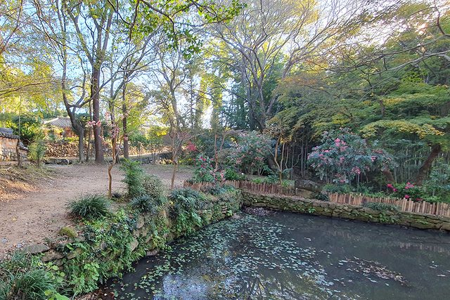 有池塘,周圍排列怪石,春天時櫻花、玉蘭和杜鵑齊放,夏天時蓮花和紫薇花盛開、景色