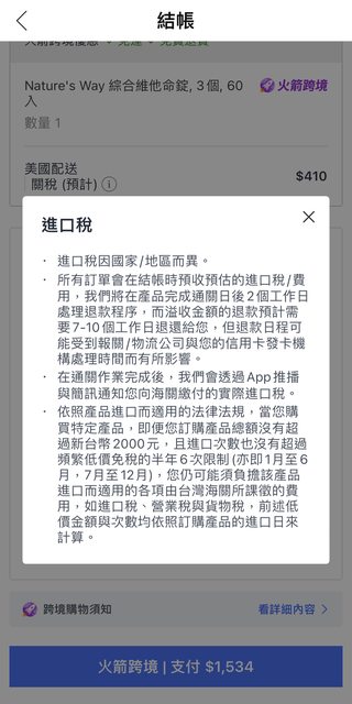 酷澎app結帳關稅說明: