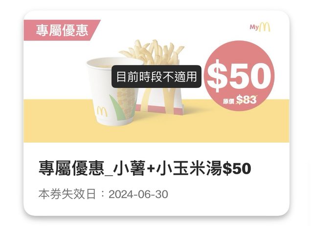 → hantulee: 送一,通常薯餅券券是週一到週三可用 27.242.64.160 06/30 12:51