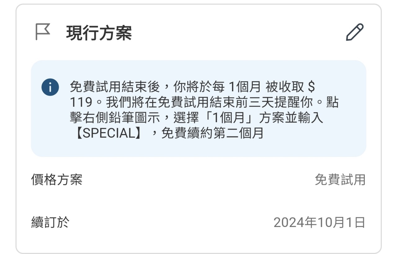 推 taco0234: 剛剛測試第一個月訂閱先套用優惠券 211.72.223.20 09/01 17:05