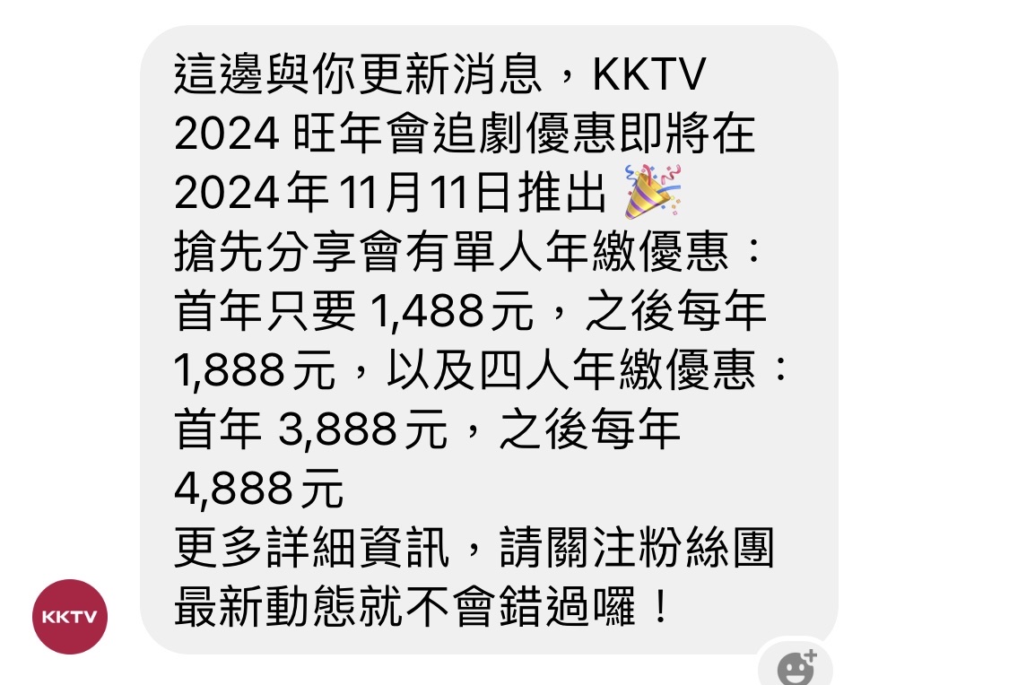 → chun0629: 我看OTT版流出來的優惠 KKTV要四人團才 218.161.104.1 11/07 20:26