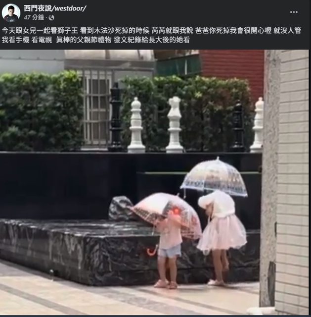 西門夜說/westdoor/ 51分鐘 · 今天跟女兒一起看獅子王 看到木法沙死掉的時候 芮芮就跟我說 爸爸你死掉我會很開心 喔 就沒人管我看手機 看電視 真棒的父親節禮物 發文紀錄給長大後的她看 https://i.imgur.com/t91rr1d.png