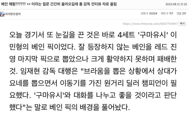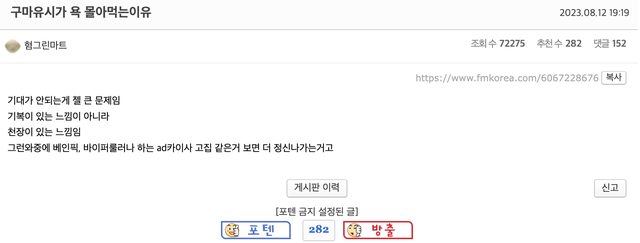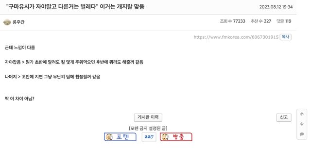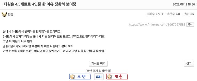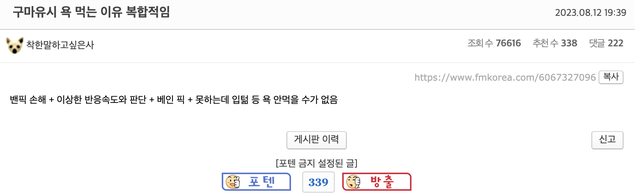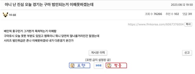 因為太興奮導致第四局不管BP還是在遊戲內都栽跟頭,然後第五局不知道為啥,就像滑鼠 突然著了火,不知道自己遊戲中強勢的時機,無知的遭受一擊後就大爆炸,這個模式太明 顯囉。即使上了決賽,只要打到第五場就會出樣同樣的習慣。我沒有要貶低誰也不是要 找犯人,只是感覺這是整個T1的問題。 ->用4連亞軍的模式在敗者組淘汰?那感覺世界賽無望了 ->超搞笑的是,他們是忘記自己是9勝9敗隊嗎?變得這麼傲慢真不可思議,你們是強隊嗎? ->第四場除了汎沒別的AD可以選嗎?路西恩,法洛士甚至愛希都比汎好 ->是熟悉的味道 kkkk 另一篇與上一篇相似的文:https://www.fmkorea.com/6067082950 ->上次是煞蜜拉,這次是汎,真的是 哈 再追加一個對面玩得好的都不ban,像今天的牙凝 跟牛,第四場真的都瞎雞巴亂搞,沒看過他們在第四場選過正常組合的 ->啊C8每次他們這樣搞的時候我都氣到像得火病,必須要躺下來一樣 ->這幫傢伙們每次形式都一模一樣kk 罵Gumayusi系列: 今日姑媽挨罵的理由很複雜: https://i.imgur.com/l6OV3Yq.png