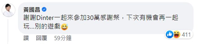 黃國昌 謝謝Dinter一起來參加30萬感謝祭,下次有機會再一起玩…別的遊戲 合照把丁特拍的好胖 = = -- https://i.imgur.com/iutWP9i.gif