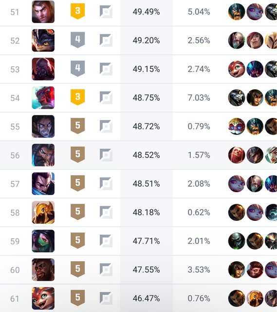 但是這麼優秀的老英雄,在2024的今天,卻是勝率靠後,在上路的61個英雄中排名53名,