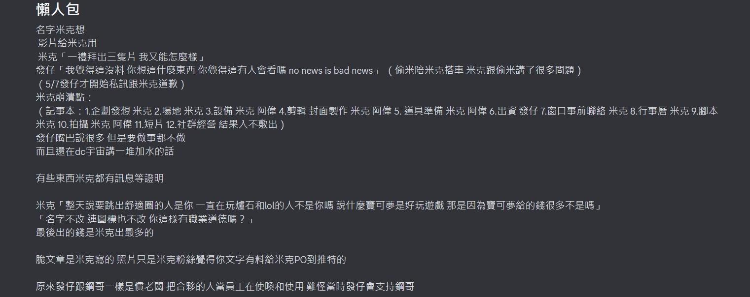 推 qwe80434 : 拆夥原因 發仔長期PUA米克 加上工作分配比例不均 05/08 01:23