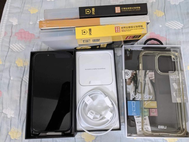 有原廠盒、原廠充電線(只拿出測試過充電,跟新的一樣),只要原廠的內容物都在,送UAG全透明保護殼、ODYSSEY 軍規防摔掛繩手機殼跟數張保護貼,手機已安裝防窺保護貼