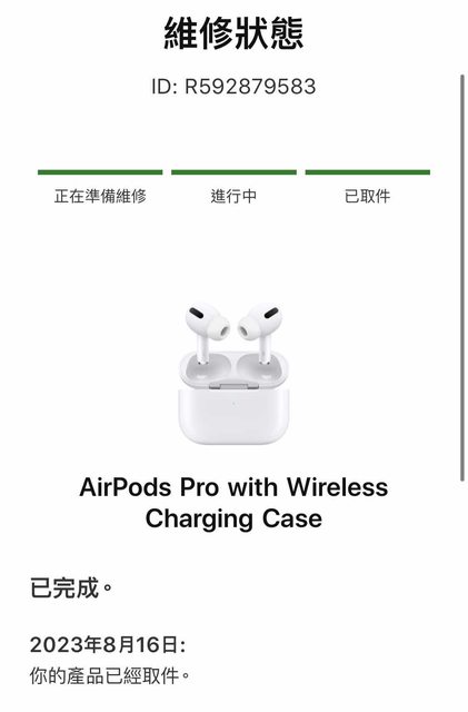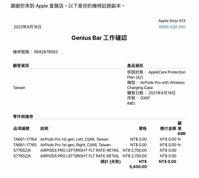 於昨晚8/16至信義A13直營店換取全新左右耳及全尺寸耳塞,未試戴。附上維修紀錄副本