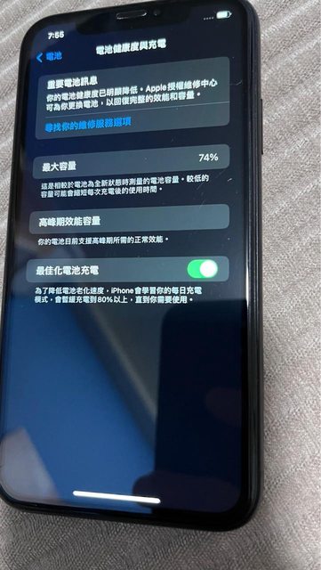 iOS 17.4.1,電池健康度74%,無維修紀錄