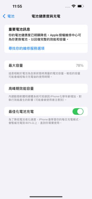 電池最大容量已低於80% 但在保固內 所以可以免費更換電池
