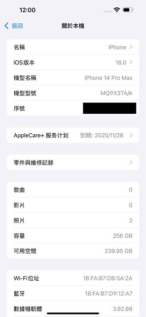 保固內 保固至2025/11/28 (有加購applecare+)