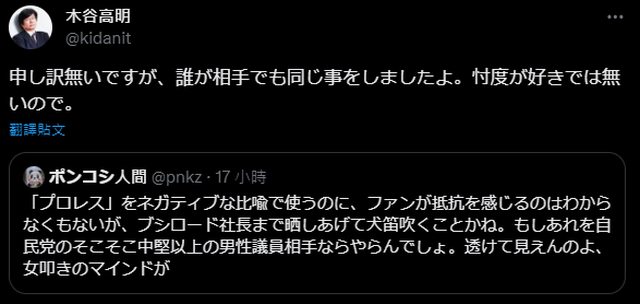 昨天在推特發表歧視摔角圈的言論