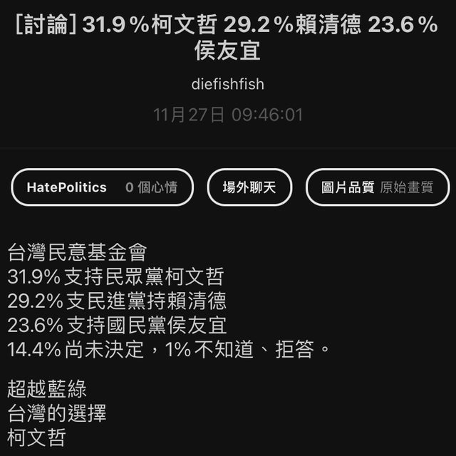 標題最新民調 柯31.9 賴29.2 侯23.6