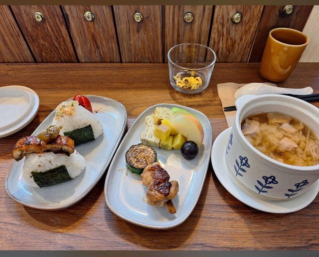: 兩顆飯糰+中間配菜+右邊湯和一杯飲料