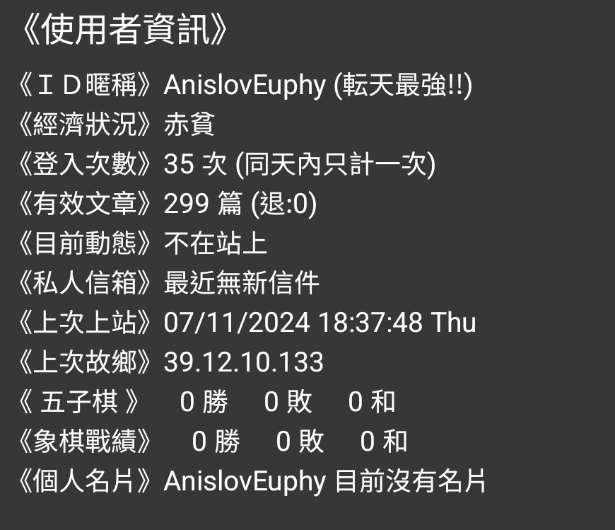→ AntiEntropy: 這個帳號已經4天沒登入了== 07/16 17:19