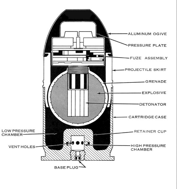 高低壓榴彈在榴彈彈殼裡有兩段設計,尾端的高壓區火藥點燃後產生燃氣,