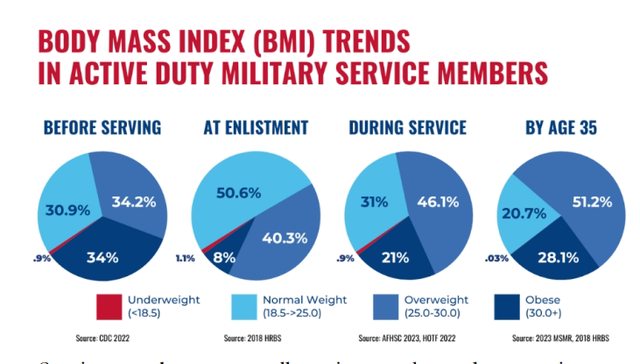 原文來源: 另類國安疑慮 逾6成美軍官兵超重肥胖 https://news.tvbs.com.tw/world/2279913 原文摘要: 美國五角大廈恐怕又有新的難題得傷腦筋,引述華府智庫「美國安全計畫」(The American Security Project)調查報告,現役美軍官兵中超過6成比例,有超重或肥胖的 健康問題,而且過去十年以來,被歸類肥胖的官兵比例,足足增加一倍之多,2012年的 10.4%,到了2022年大幅成長為21.6%,這個趨勢發展讓民團非常擔心,害怕會影響美軍部 隊整體戰力。 智庫報告以身體質量指數(BMI)為基準,研究現役的美軍官兵身體變化,分為入伍前、 入伍初期、服役數年後和35歲以後四個階段。無論哪個階段,小於18.5過輕的群體都是最 少,平均只有1%或以下。介於18.5至25之間的健康體型,則在入伍初期達到巔峰的50.6% ,服役多年後下降為31%,當官兵的年齡超過35歲之後,維持健康體型的比例更只剩20.7% 。 超重(25至30)和肥胖(30以上)比例在服役前合計68.2%,入伍初期在良好訓練下,大 幅下降為48.3%,但當服役一段時間之後,兩者合計比例就逐步回升至67.1%,35歲以上的 美軍成員,則有79.3%存在超重或肥胖的健康問題。 報告圖表:https://i.imgur.com/BCzX1zX.jpg