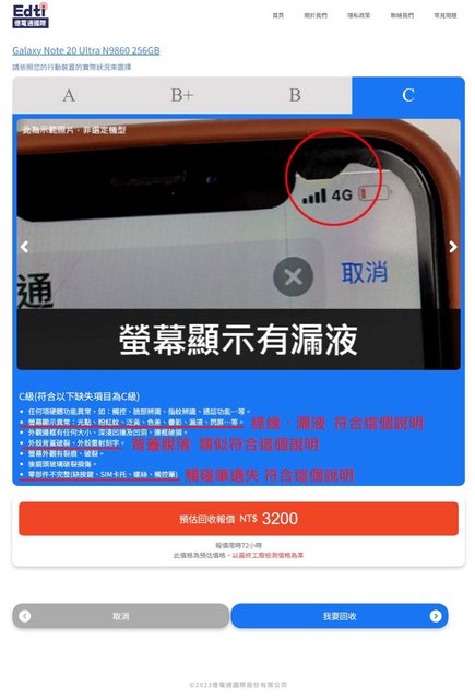 接著就是選擇手機機況估價 總共有分成4個等級:A、B+、B、C 每個等級對應不一樣的手機狀態 因為我這隻NOTE 20 U 有以下瑕疵 1.綠線 2.漏液 3.背蓋脫落 4.觸碰筆遺失 對比了一下就選擇了 等級C進行回收 https://i.imgur.com/NMzLOdL.jpg