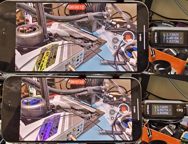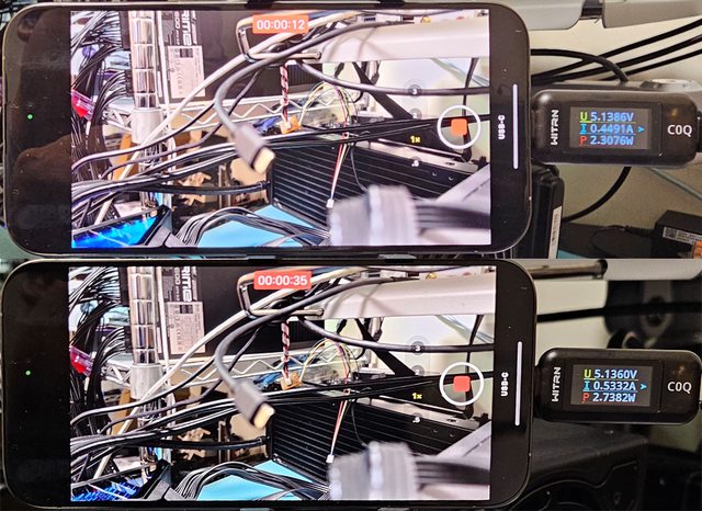 ,於相同錄影時間下手機本身及外部儲存裝置的溫度增加幅度會比較小。因為錄影中會持