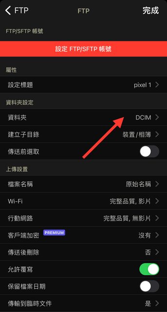 欲備份手機的PhotoSync設定一樣伺服器與端口(截圖灰色區域),並選擇備份到DCIM的資料夾,也可以建立子目錄。