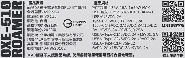 ▼延長線背面標籤有產品名稱、產品資訊、產品規格、注意事項、LINE即時客服/線上產