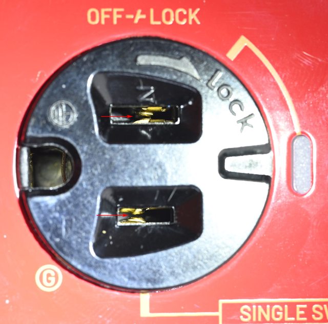 ▼旋轉插座轉至LOCK時,除了接通電源外,內部導體凸點(紅色箭頭)會夾住插頭插片上的