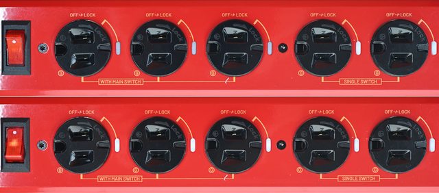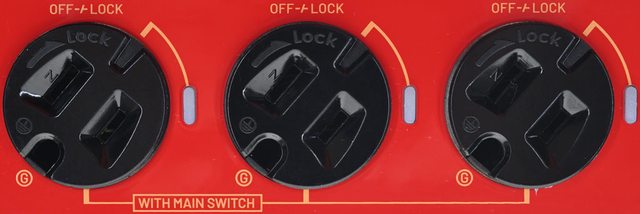 ▼帶燈開關可一起控制3個標示WITH MAIN SWITCH的旋轉插座電源,開關打開會點亮紅燈