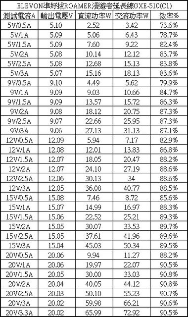 ▼USB-A單獨使用下各組輸出轉換效率表,整體輸出轉換效率在72.2%至82.8%之間