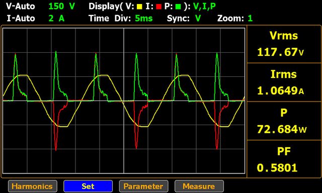 ▼USB-C1輸出65W的輸入交流電壓/電流/功率波形如下圖所示