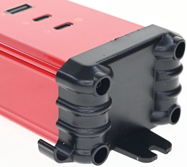 ▼延長線採用紅色亮面烤漆鋁合金外殼,正面有過載無熔絲開關、帶燈開關、5個旋轉插