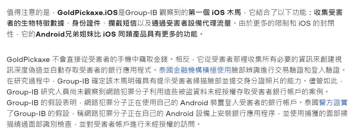由於這個木馬能夠取得「用戶的生物辨識資訊」以及「身份證件資訊」,攔截「OTP 驗證