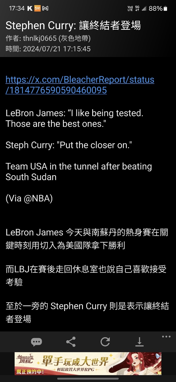 → kevenchia : 人>老詹 畢竟熱身賽路人也帶隊兩場惹 07/20 10:55