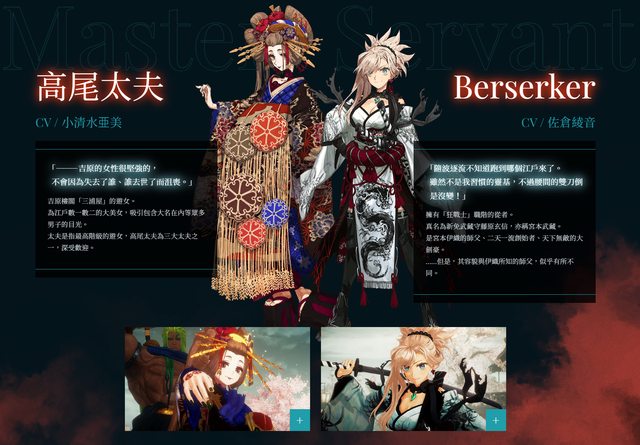 Berserker的御主是江戶時代的名花魁高尾太夫,從者則是女武藏