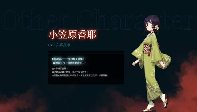 其他角色還有義妹小笠原香咲和宮本武藏的遺產紅玉之書