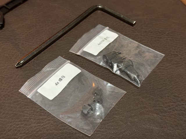 配件包含多平台扣具、背板及簡易螺絲起子。螺絲、螺母等小零件以夾鏈袋分類包裝且有