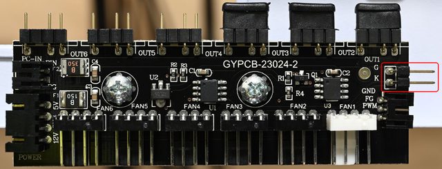 ▼燈光風扇控制板,提供6個3pin ARGB插針(OUT1至OUT6)及6個風扇4pin插針(FAN1至