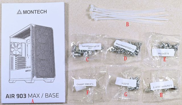 板銅柱/2.5吋SSD螺絲(D)、電源/介面卡螺絲(E)、銅柱套筒工具(F)、3.5吋硬碟螺絲(G)