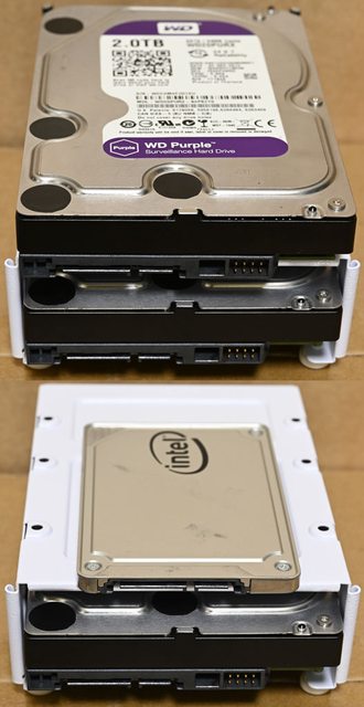 ▼3.5吋/2.5吋固定架安裝2個3.5吋硬碟(上)或1個2.5吋SSD加1個3.5吋硬碟(下)示意圖
