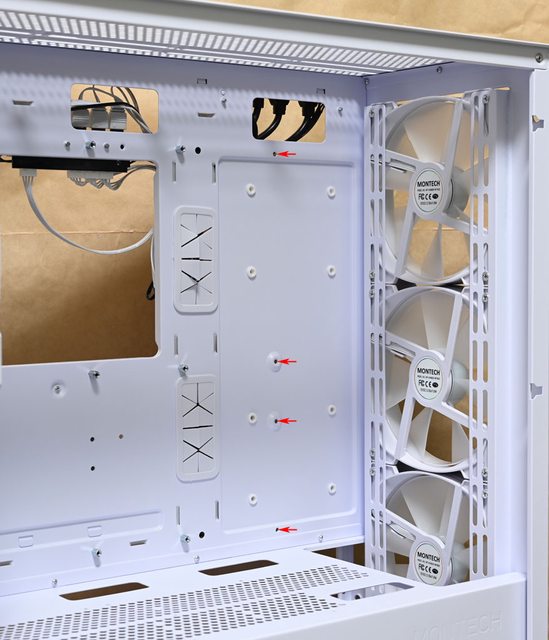 ▼底板前端增設E-ATX主機板用鎖點(紅色箭頭),不過E-ATX主機板會阻擋到底板前方穿線