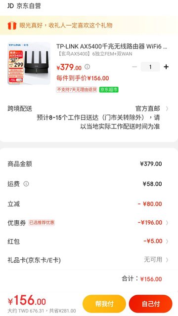 推 tim23: TPLINK AX3000只要167人民幣(券199-50) 112.78.92.15 07/14 20:23