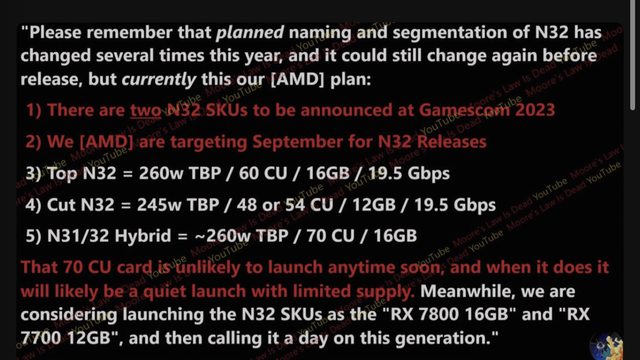 根據Moore’s Law is Dead的最新影片 GPU製造商已經完成了其Navi 32 GPU的開發,並且已經發布了功能驅動 這位YouTuber一直在密切關注RDNA3桌上型開發的進展 並率先洩露了有關Navi 31/32混合GPU的訊息 該GPU可能會在稍後推出的產品中配備70個CU(計算單元)。 此外採用Navi 32的型號的初始規格已經出現 雖然型號名稱尚未確認 但值得注意的是Radeon RX 7800XT最近出現在EEC列表中 表明它將配備16GB 256位元記憶體匯流排 此特定版本可能會利用GPU的完整60CU配置 並且總板功率 (TBP) 為260W。Navi 32 GPU的另一種版本 可能被命名為Radeon RX 7700 XT,預計將支援48至54個CU配置 並在192位元記憶體匯流排上配備12GB記憶體 新訊息表明這兩種型號都將配備19.5Gbps記憶體。 VDZ編譯 https://videocardz.com/newz/amd-navi-32-based-radeon-rx-7800-7700-series-reportedly-targeting-september-launch https://i.imgur.com/UK1heVr.jpg