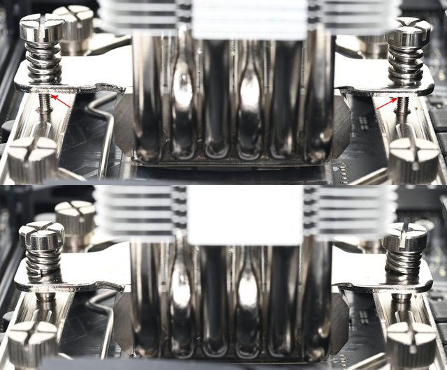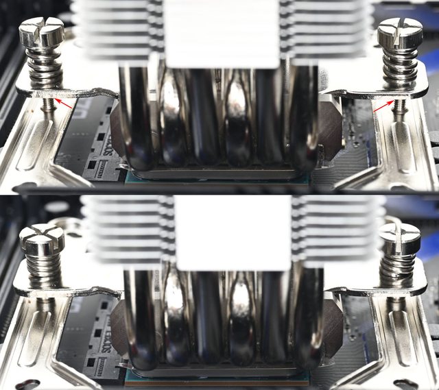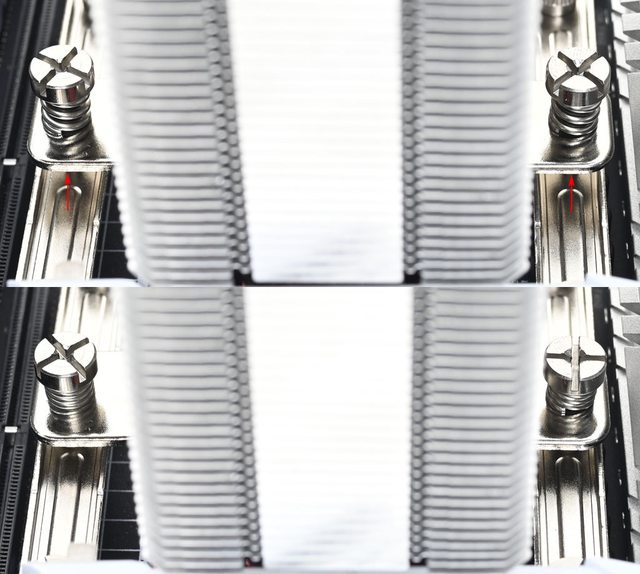 ▼從側面看,壓板中間用1個手轉螺絲固定在散熱器底座頂部,壓板兩邊設置鎖在托架上