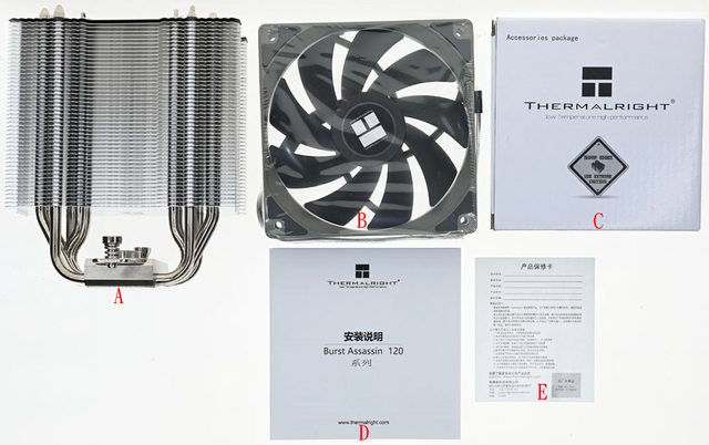 ▼包裝內容有散熱器(A)、TL-C12C風扇(B)、安裝配件盒(C)、安裝說明書(D)、保證卡(E)