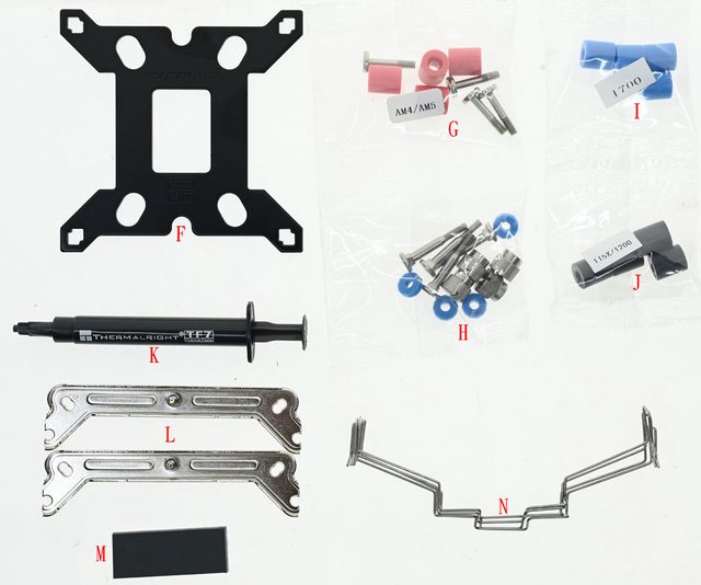 (I)、Intel LGA1200/115x黑色套管(J)、TF-7散熱膏(K)、托架(L)、防震膠墊(M)、風扇