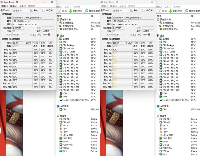 ▼待機(左)及高負載(右)的CORE TEMP及AIDA64感測器畫面