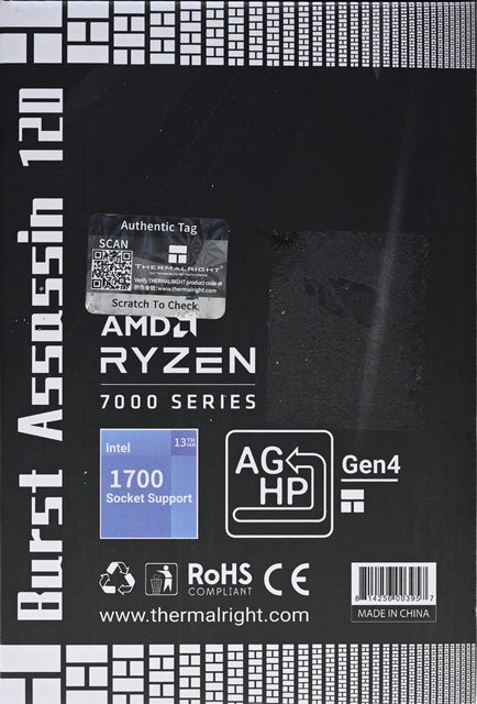 ▼此面外盒有Burst Assassin 120產品名稱、防偽驗證標籤、支援AMD RYZEN 7000圖示、