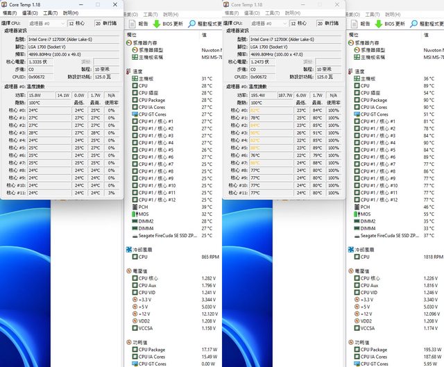 ▼前面12公分風扇搭中間14公分風扇時待機(左)及高負載(右)的CORE TEMP及AIDA64感測