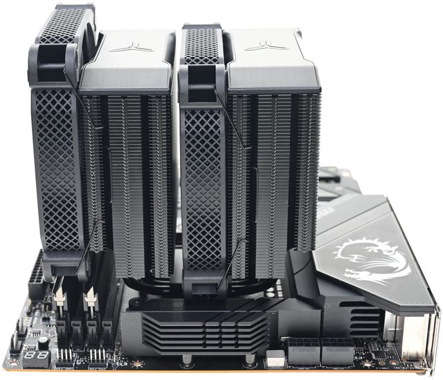 ▼當前塔安裝120mm風扇,後塔安裝140mm風扇時,安裝於LGA1700平台的側面圖。搭配