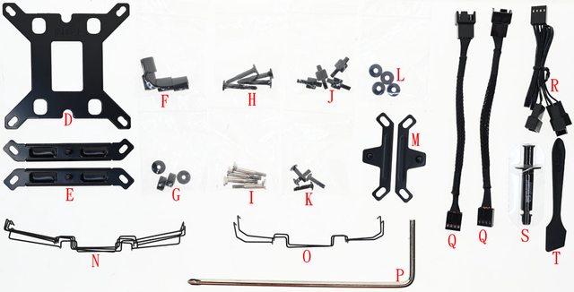 ▼安裝配件有Intel LGA1700/1200/115x/1366背板(D)、Intel托架(E)、套管(F)、Intel